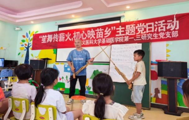 活动中,党员志愿者团队深入丹寨县展良村、金山村,依托“为爱黔行儿童服务站”,开展为期多日的关爱服务。通过“课业加油站”一对一辅导、安全健康教育小课堂、绘画与手工兴趣班等形式,有效缓解留守儿童暑期“看护难”问题,帮助他们提升学习能力、增强安全意识、培养兴趣爱好。志愿者团队还为孩子们带来芦笙体验课,讲解乐器构造与演奏技巧。课堂上,孩子们兴趣高涨,笙声与笑声交织,文化的火种在心中点燃。