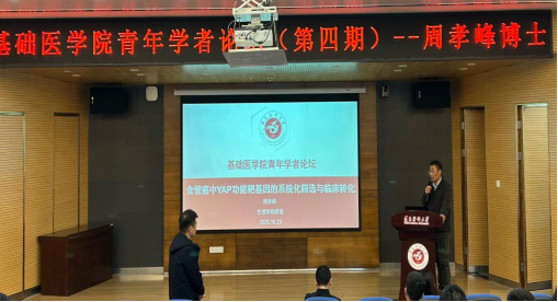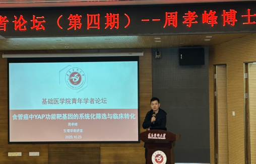 2025年10月23日,太阳成tyc7111cc成功举办了第四期青年学者论坛。本次论坛由生理学教研室青年博士周孝峰主讲,主题为“食管癌中YAP功能靶基因的系统化筛选与临床转化”。太阳成tyc7111cc副经理韩勇、生命科学研究院副经理保玉心出席了此次论坛,生理学教研室主任孔德营副教授担任主持,公司全体博士参加了本次讲座。