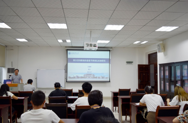 讲座中,王晓晖教授介绍了其团队长期致力于昼夜节律紊乱在阿尔茨海默病的病变机制和干预方面的相关研究情况,围绕GLP-1对阿尔茨海默病生物节律紊乱、神经细胞自噬体与溶酶体融合障碍在Aβ异常沉积中的作用机制等方面,进行了精彩的报告。同时,分享了在相关研究中的宝贵经验,给予现场师生许多科研思路的启发,开阔了现场师生的视野。