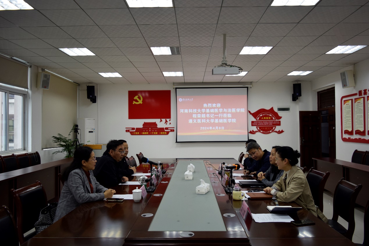 2024年4月8日上午9:00,河南科技大学基础医学与法医公司程荣超书记、副经理王萍、副经理胡伊乐一行来院调研交流,基础医公司党委书记罗军敏、副经理刘晖(主持工作)、副书记袁晓峰、法医公司刘云经理等参会交流。座谈交流会由罗军敏书记主持。