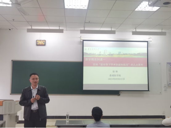 徐林经理对2023级研究生新生的到来表示热烈欢迎,并以《坚持“新形势下学术创新和规范”的几点思考》为题给同学们讲了一堂精彩的“开学第一课”,强调做科研要无畏艰难,以“顶天立地”的精神,探索未知,不断突破科技边界,坚守科研诚信。
