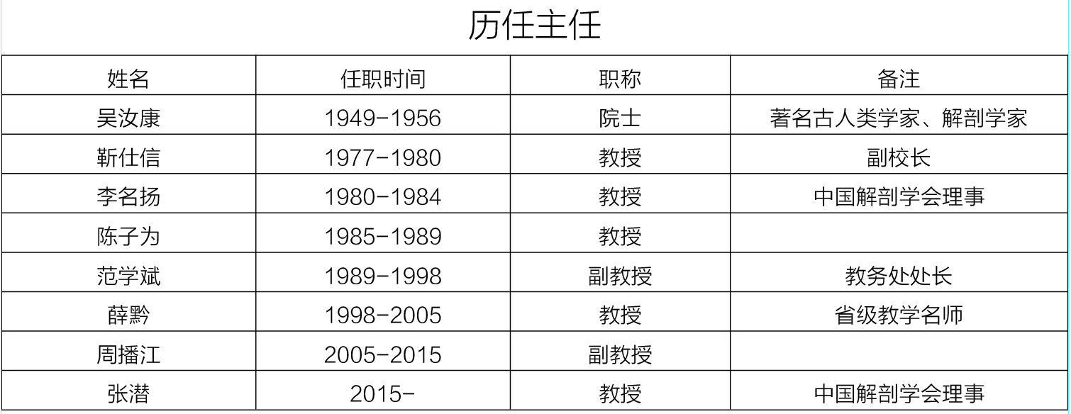 人体解剖学教研室前身为大连医公司解剖学教研室,1969年南迁到遵义,至今已走过50多年的光辉历程。上世纪50年代起,著名古人类学家、解剖学家吴汝康学部委员、解剖学家靳仕信教授、李名扬教授等曾先后担任教研室主任,是公司历史悠久、最具影响力的教研室之一。教研室全体老师秉承遵医精神,在教学与科研上均取得较好的成绩,尤其在人类骨骼肌的形态学研究取得丰硕的成果,在国内有一定知名度。参与编写了全国统编教材《人体解剖学》(第一版),其中参编的《人体解剖彩色挂图》获国家教委优秀教材特等奖,《人体解剖彩色图谱》获国家新闻总署优秀图书一等奖。近年来,先后获得省科技进步二等奖2项,三等奖3项,省卫生厅成果一等奖2项。